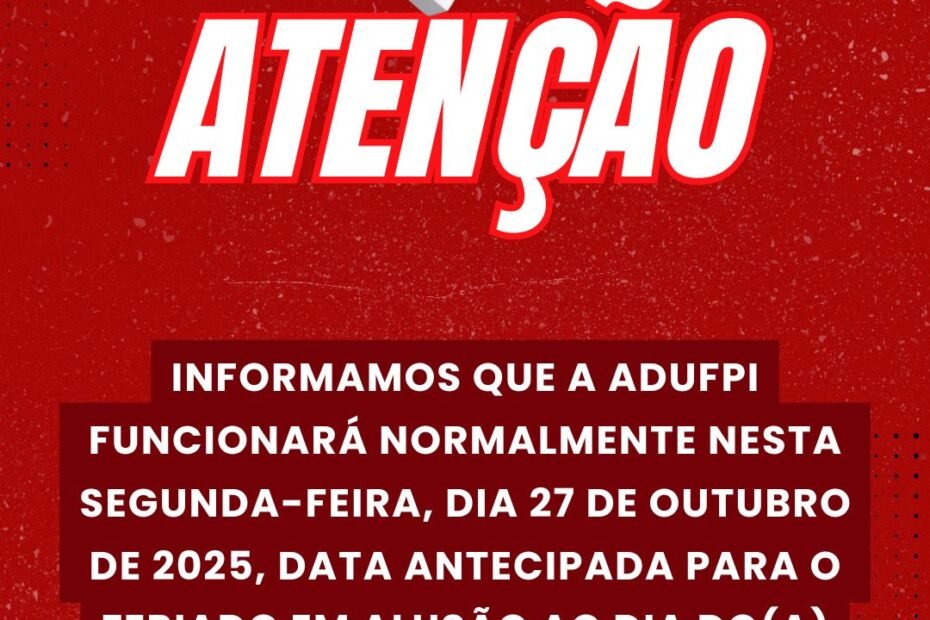 informamos que a ADUFPI funcionará normalmente nesta segunda-feira, dia 27 de outubro de 2025, data antecipada para o feriado em alusão ao dia do(a) Servidor(a)… Continue a ler »AVISO: A ADUFPI funcionará normalmente nesta segunda-feira (27)