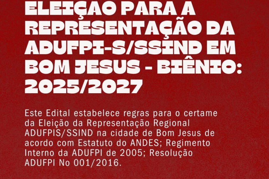Este Edital estabelece regras para o certame da Eleição da Representação Regional ADUFPIS/SSIND na cidade de Bom Jesus de acordo com Estatuto do ANDES; Regimento… Continue a ler »REGULAMENTO DA ELEIÇÃO PARA A REPRESENTAÇÃO DA ADUFPI-S/SSIND EM BOM JESUS – BIÊNIO: 2025/2027