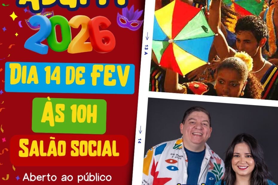 CARNAVAL ADUFPI 2026: Dia 14 de FEVEREIRO de 2026, às 10h, no Salão Social