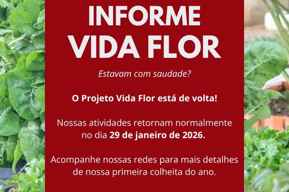 🥬 Preparados(as) para a nossa primeira colheita do ano? O Projeto Vida Flor retoma suas atividades na próxima quinta-feira, dia 29 de janeiro de 2026.… Continue a ler »Projeto Vida Flor retorna às suas atividades nesta quinta-feira, dia 29 de janeiro de 2026.