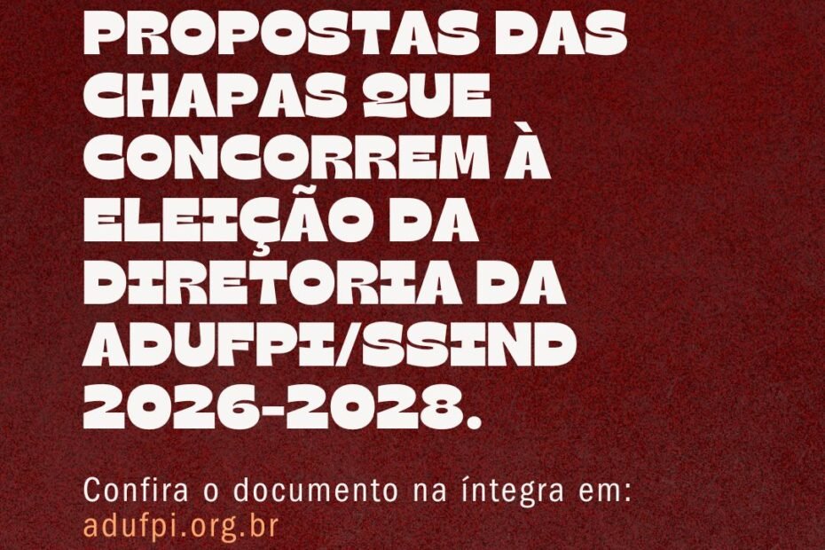 Com o objetivo de fortalecer a transparência e o processo democrático, a ADUFPI disponibiliza as cartas-propostas das chapas que concorrem à eleição da Diretoria para… Continue a ler »Confira as cartas propostas das chapas que concorrem à eleição da Diretoria da ADUFPI/SSIND 2026-2028.