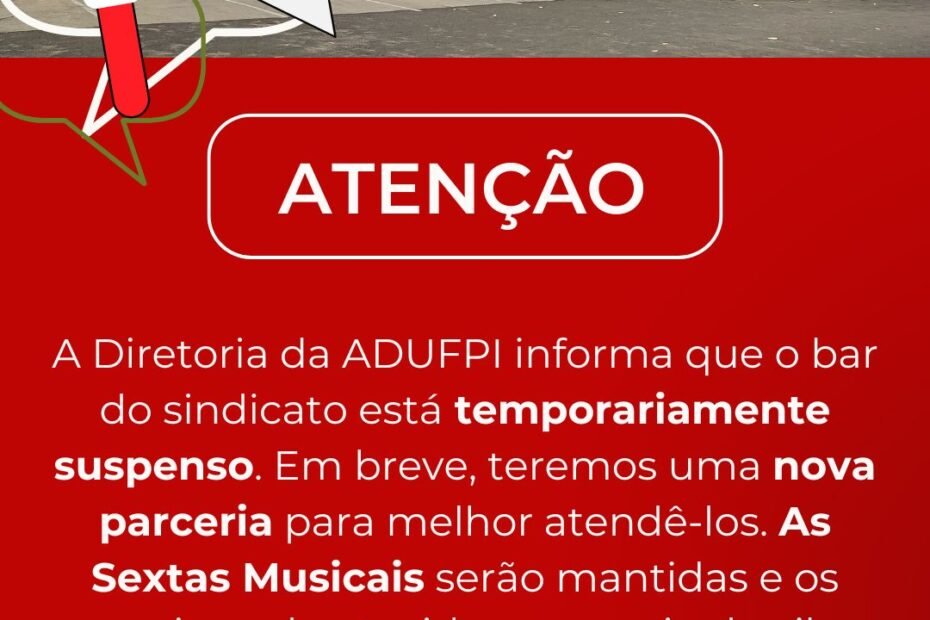 A Diretoria da ADUFPI informa que o bar do sindicato está temporariamente suspenso. Em breve, teremos uma nova parceria para melhor atendê-los. As Sextas Musicais… Continue a ler »Informe sobre a suspensão temporária do Bar da ADUFPI