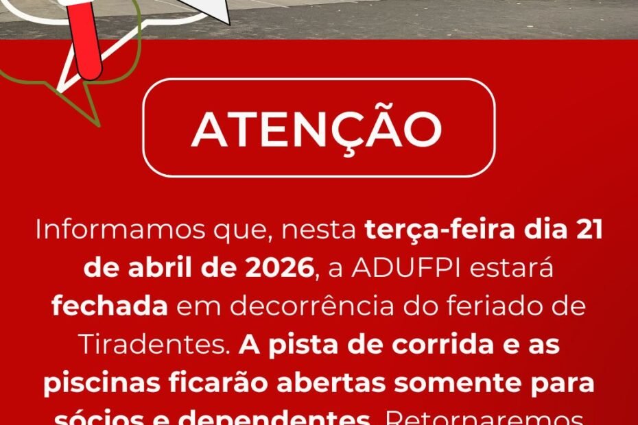 Informamos que, nesta terça-feira dia 21 de abril de 2026, a ADUFPI estará fechada em decorrência do feriado de Tiradentes. A pista de corrida e… Continue a ler »Funcionamento da ADUFPI no dia 21 de abril de 2026, feriado de Tiradentes.