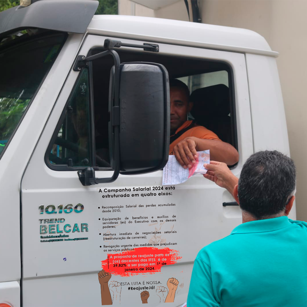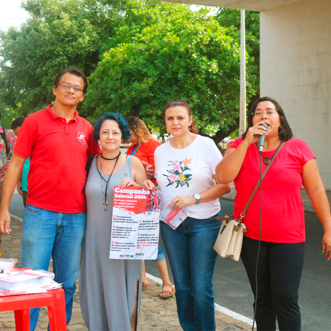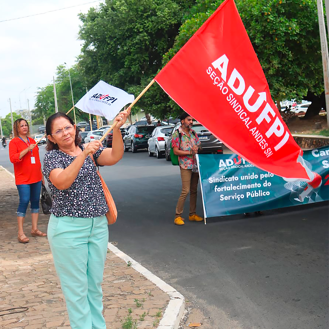 Durante a ação, a Diretora de Relações Sindicais da ADUFPI, professora Carmen Lima, destaca que” esta luta visa garantir os direitos de todas as professoras e professores que vêm sofrendo perdas desde 2015, fora os ataques institucionais e as medidas de desgoverno anterior. Precisamos lutar e nos mantermos firmes para que este percentual seja revisto e que venha favorecer todas as servidoras e servidores públicos federais”.