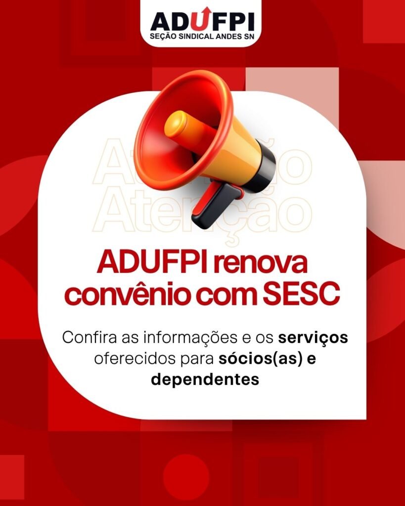A Diretoria da ADUFPI informa que o convênio com o SESC foi renovado. O convênio tem por objetivo o atendimento ao público associado da ADUFPI e seus dependentes através dos serviços oferecidos pelo Serviço Social do Comércio, com pagamento de taxas de retribuição.