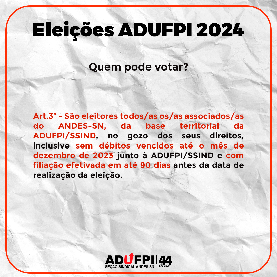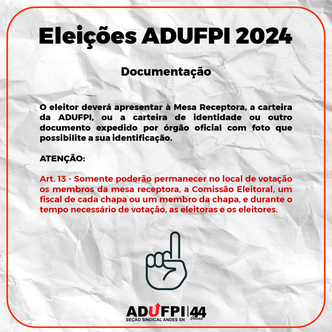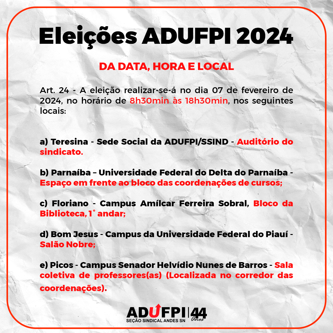 A Comissão Eleitoral da ADUFPI comunica a todos os filiados que os locais de votação para as eleições já foram definidos. Pedimos atenção especial para as informações detalhadas disponíveis no [inserir o local de divulgação] e incentivamos a participação de todos no exercício democrático do voto.