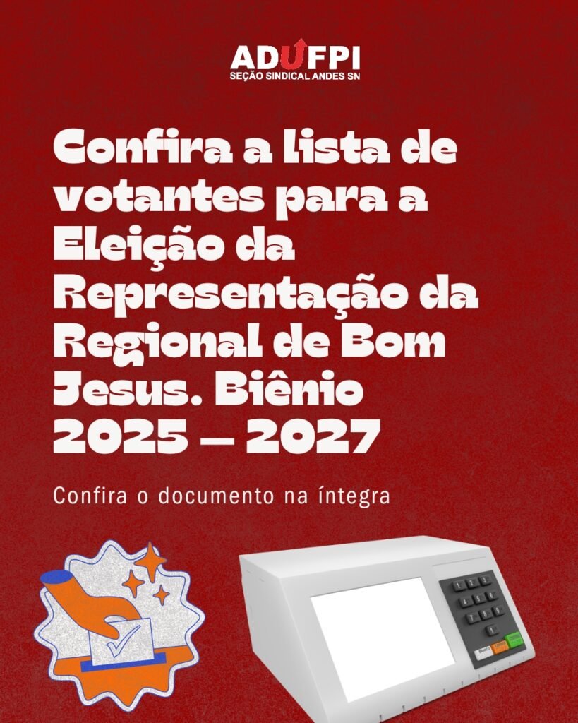 A Presidente da Comissão Eleitoral, regional de ADUFPI/Bom Jesus, de acordo com as disposições do edital de que trata da eleição para a representação da ADUFPI/SSIND em Bom Jesus – Biênio: 2025/2027, torna público, por meio desta, a lista de servidores a votarem, com as seguintes retificações: