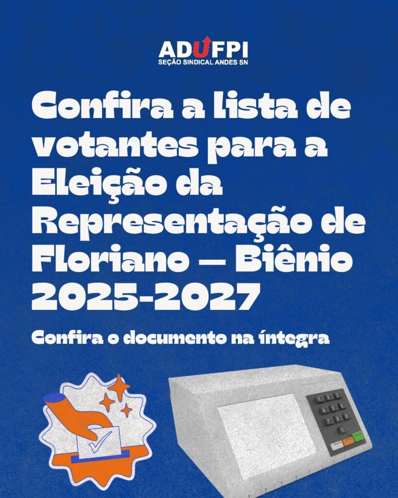 O Presidente da Comissão Eleitoral, regional de ADUFPI/Floriano, conforme as disposições do edital de que trata da eleição para a representação da ADUFPI/SSIND em Floriano – Biênio: 2025/2027, torna público, por meio desta, a lista de servidores a votarem: