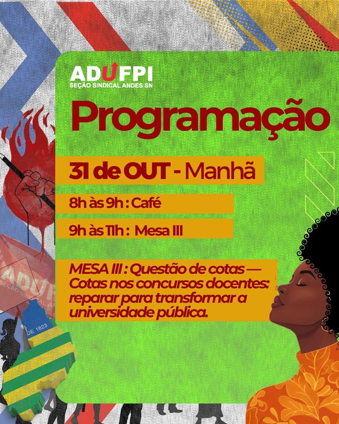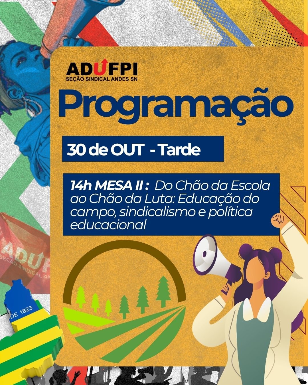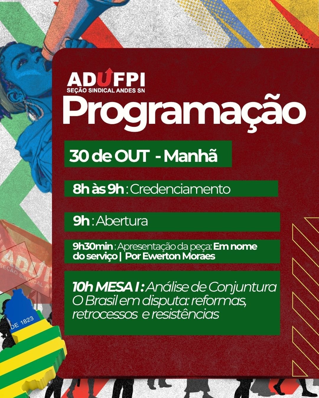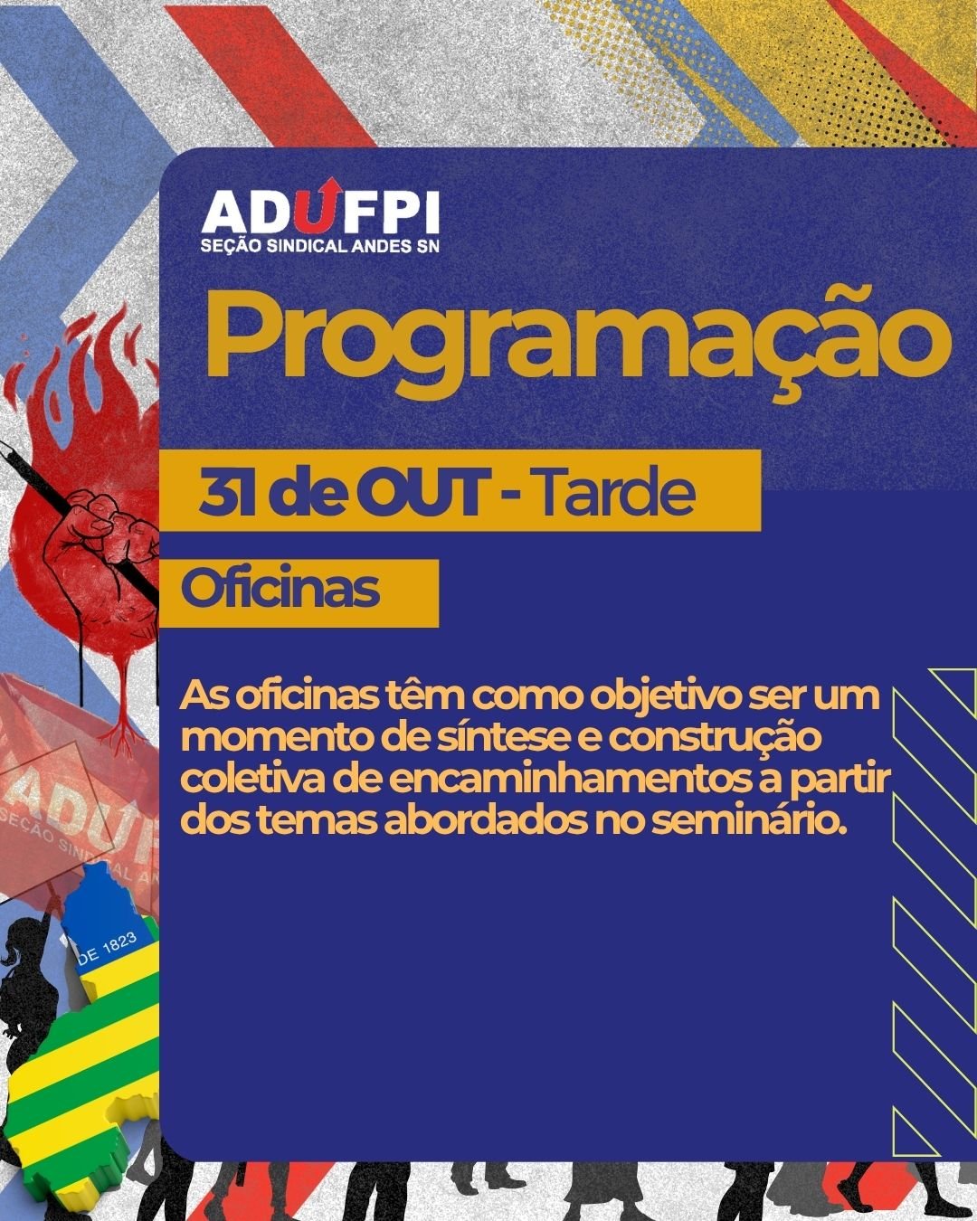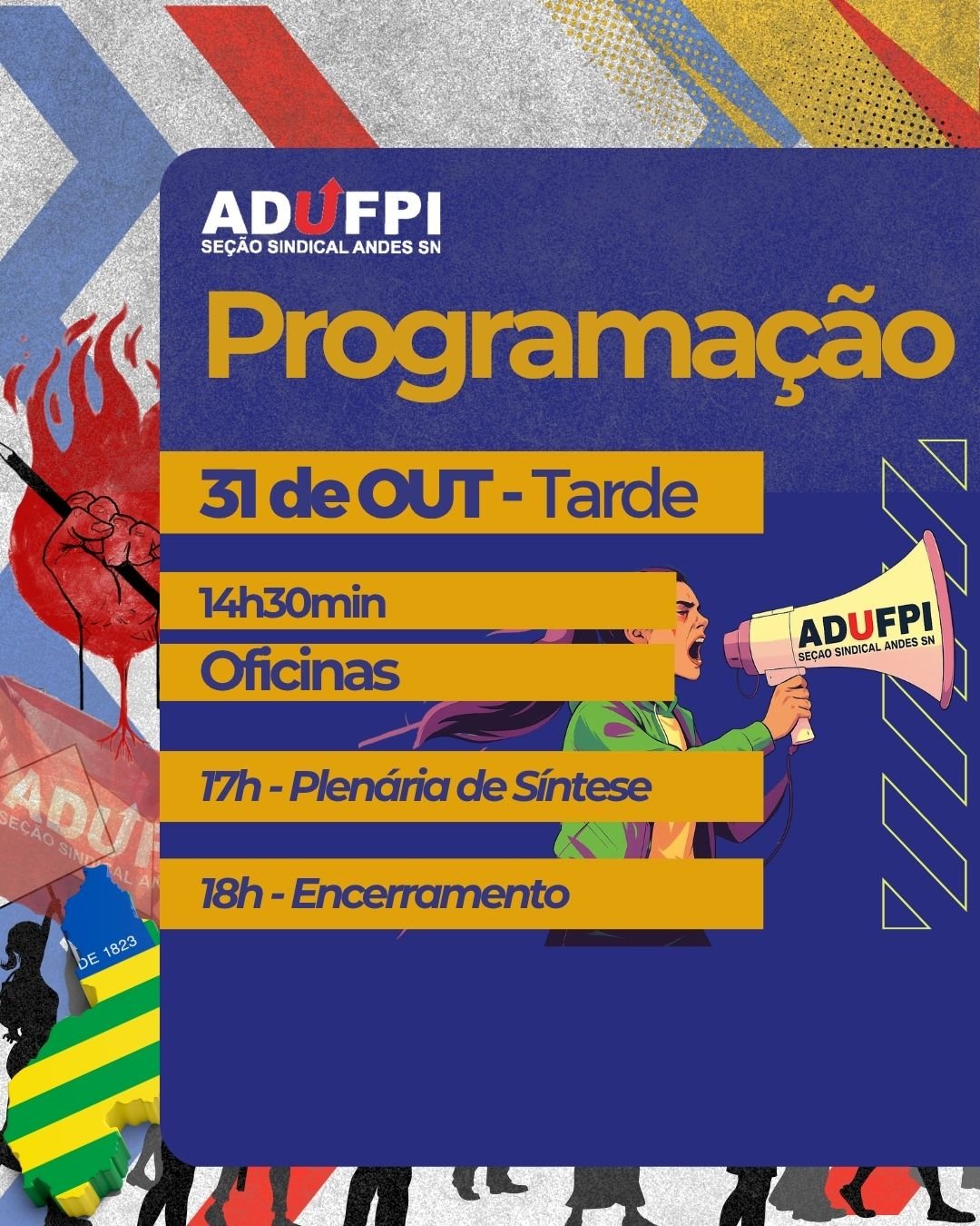 Nos dias 30 e 31 de outubro, a ADUFPI promove o II Seminário de Formação Sindical – “Reformas ou retrocesso: pela carreira, pela aposentadoria e pelos direitos”. Dois dias de escuta, debate e mobilização para compreender os ataques em curso e fortalecer a resistência docente.