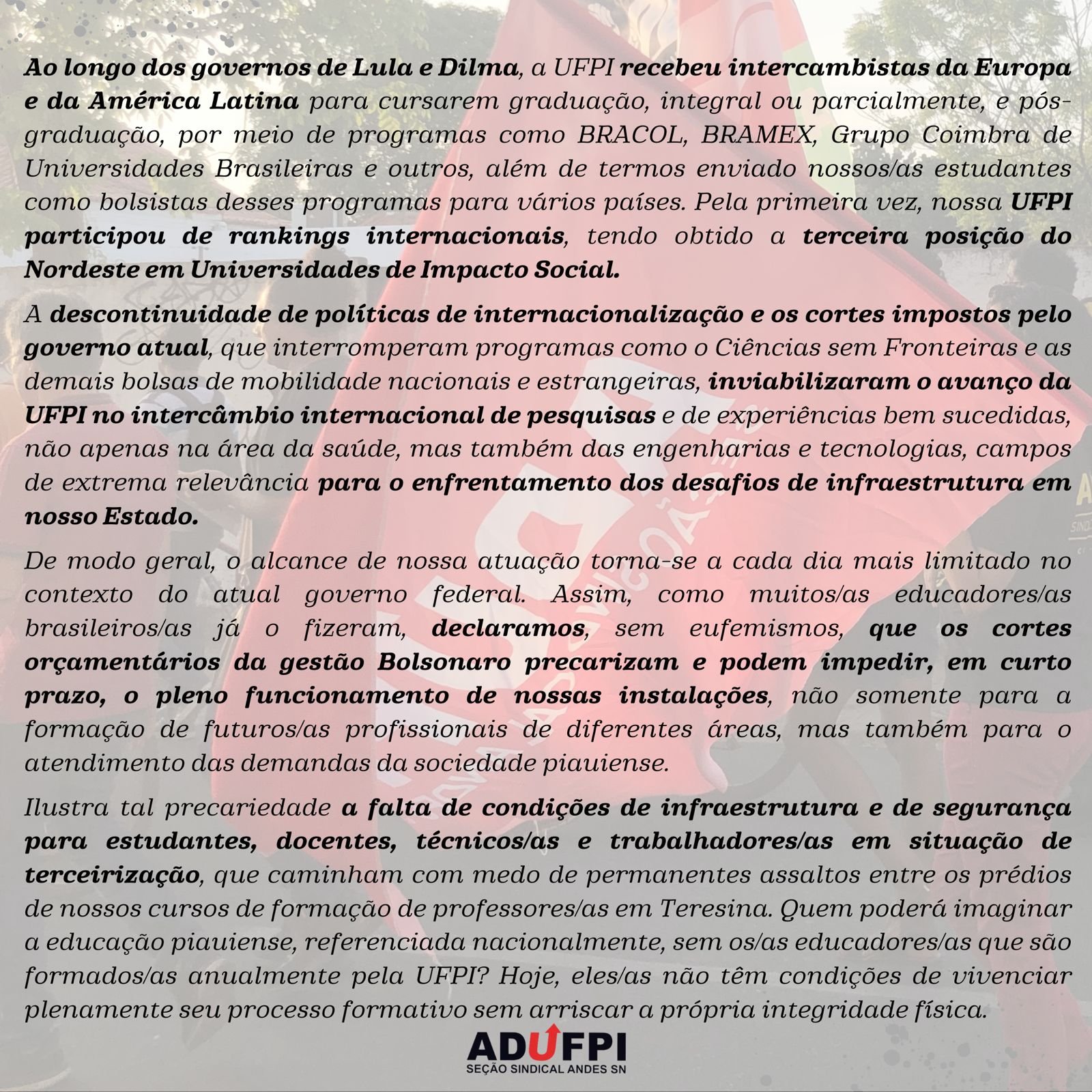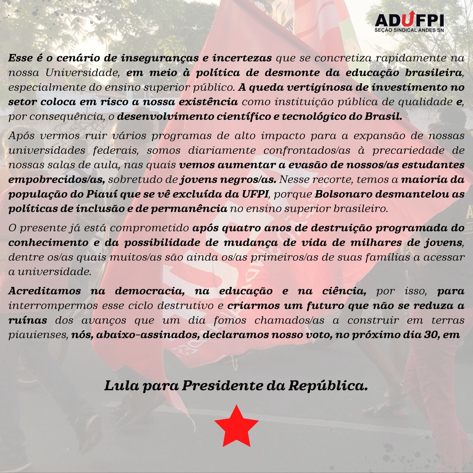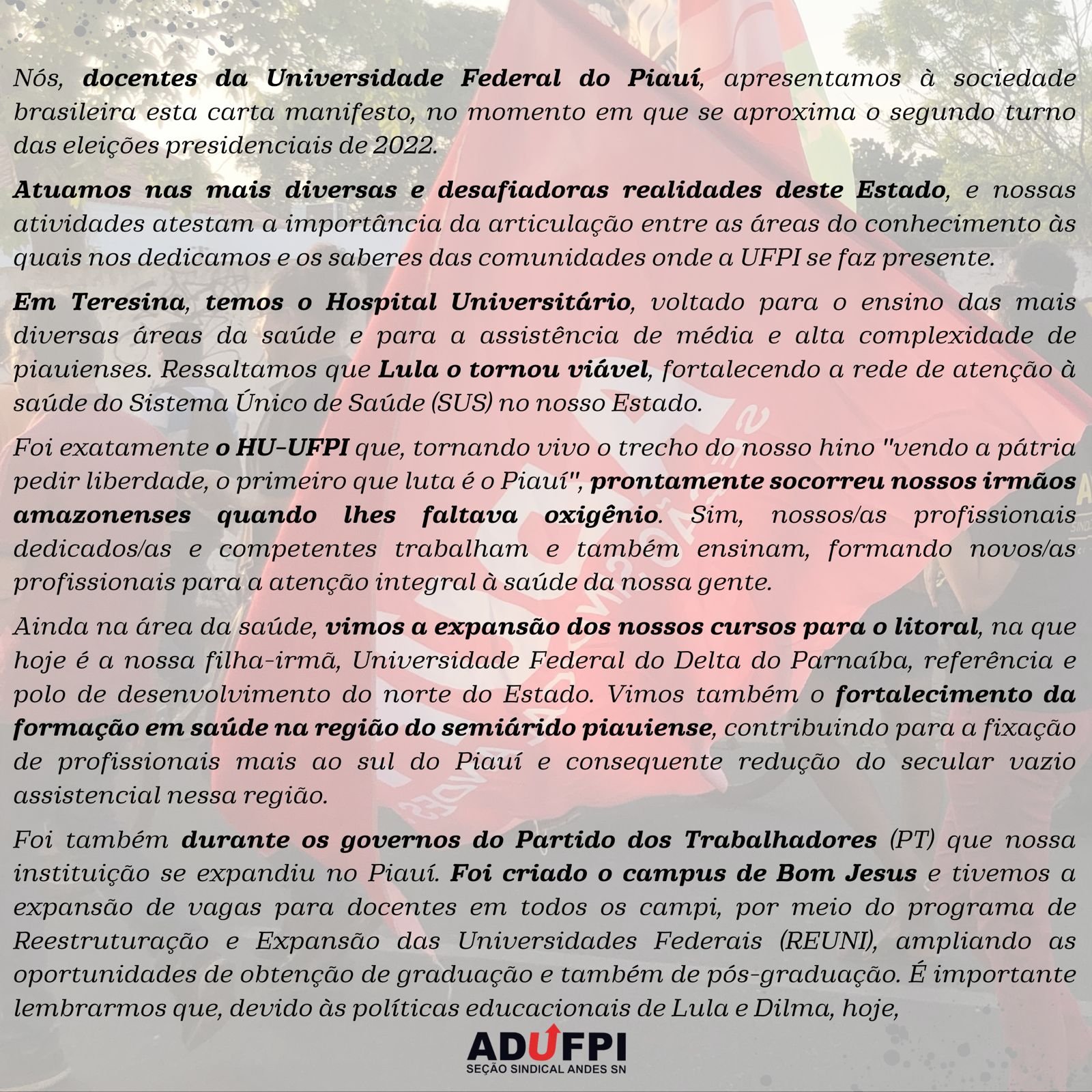 A ADUFPI, em prol da defesa intransigente de uma educação pública, gratuita e de qualidade, de políticas de inclusão e permanência no ensino superior brasileiro, torna pública a carta manifesto de docentes da UFPI com Lula para Presidente.