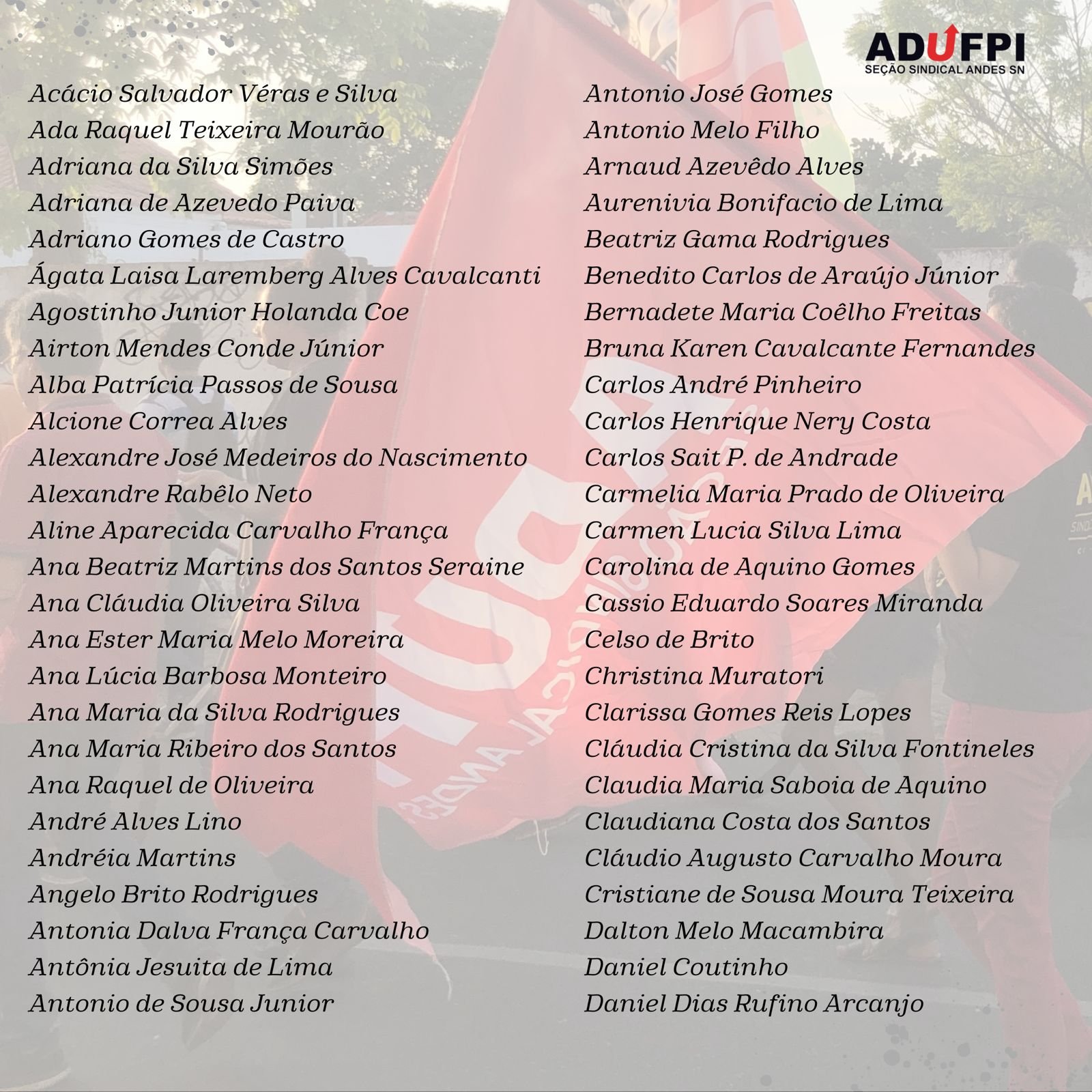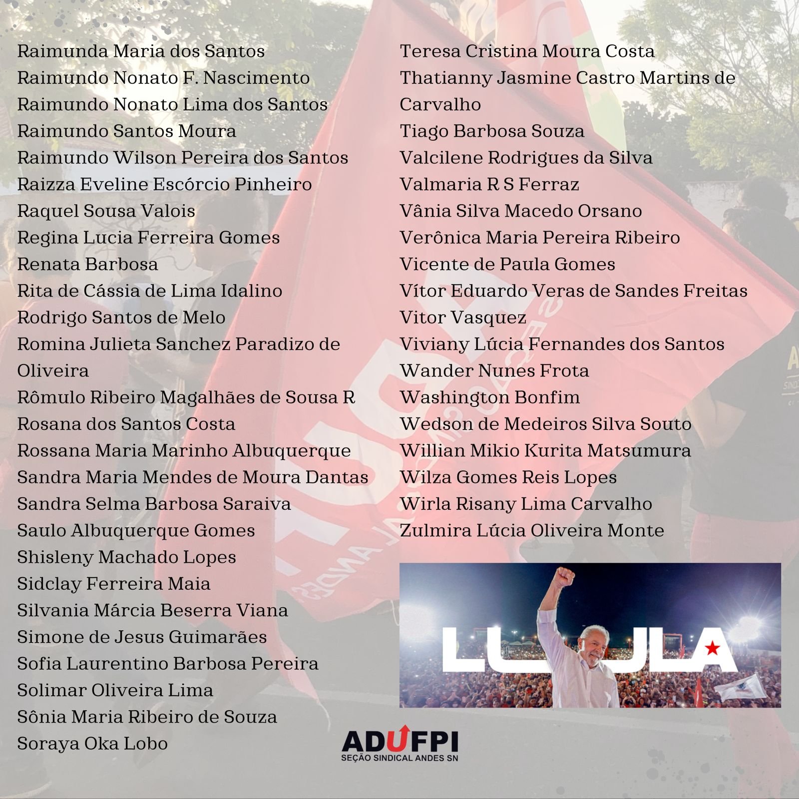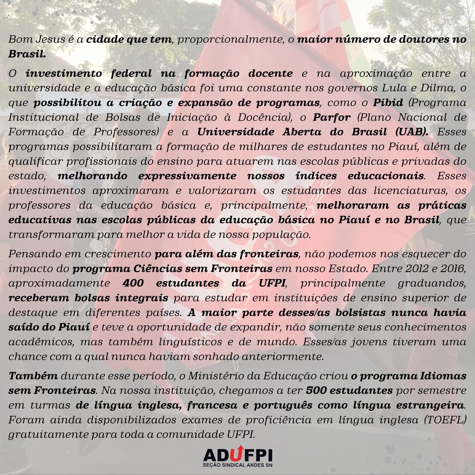 A ADUFPI, em prol da defesa intransigente de uma educação pública, gratuita e de qualidade, de políticas de inclusão e permanência no ensino superior brasileiro, torna pública a carta manifesto de docentes da UFPI com Lula para Presidente.