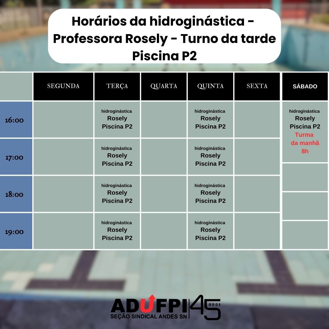 | HIDROGINÁSTICA(ROSELY) | SÁB | 8H | PISCINA – P2 |