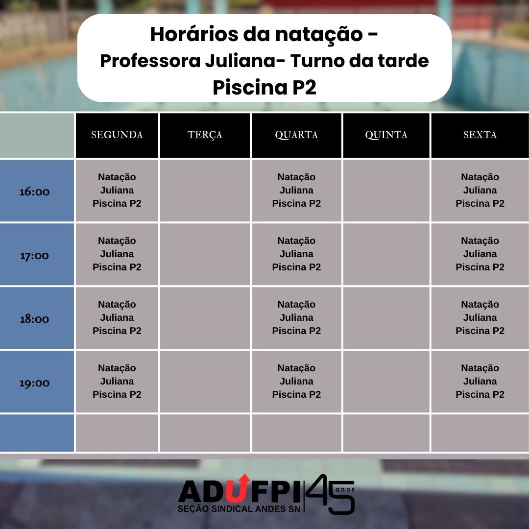 | NATAÇÃO (JULIANA) | SEG/QUA/SEX | 19H | PISCINA – P2 |