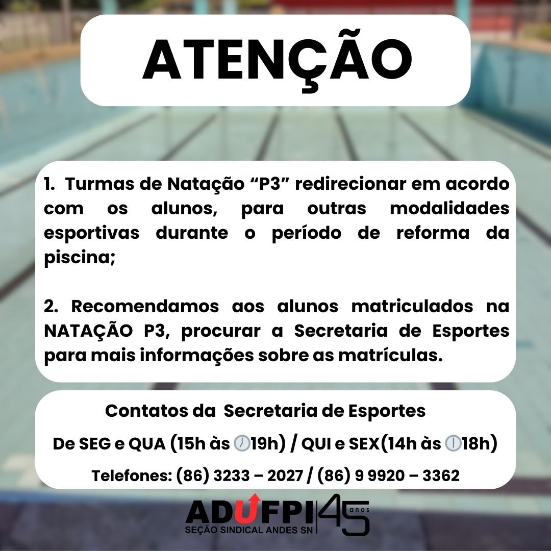 Acompanhe a tabela de atividades esportivas da piscina grande (p3) durante a reforma.