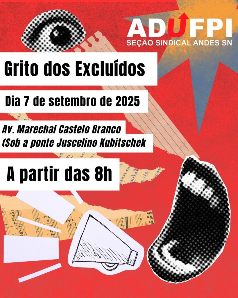 A ADUFPI convoca toda a categoria docente para se somar ao ato do Grito dos Excluídos, que acontece neste domingo, 7 de setembro, em Teresina. A concentração terá início a partir das 8h, na Avenida Marechal Castelo Branco, embaixo da Ponte Juscelino Kubitschek, nas proximidades da Agespisa.