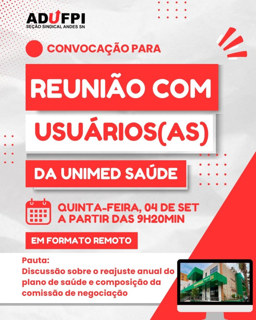 Informamos que nesta quinta-feira, 4 de setembro de 2025, ocorrerá uma reunião remota com os usuários do plano Unimed às 9h20min. O objetivo da reunião é discutir e avaliar o reajuste anual da operadora e também compor a comissão de negociação.