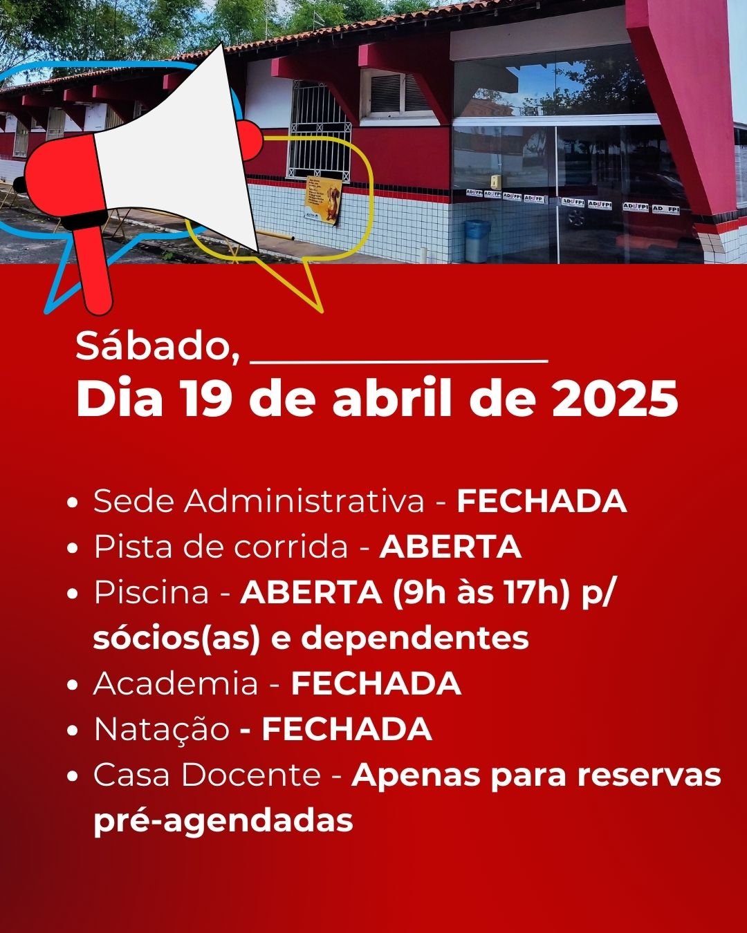 Atenção, associadas e associados ao sindicato, bem como o público frequentador da ADUFPI: