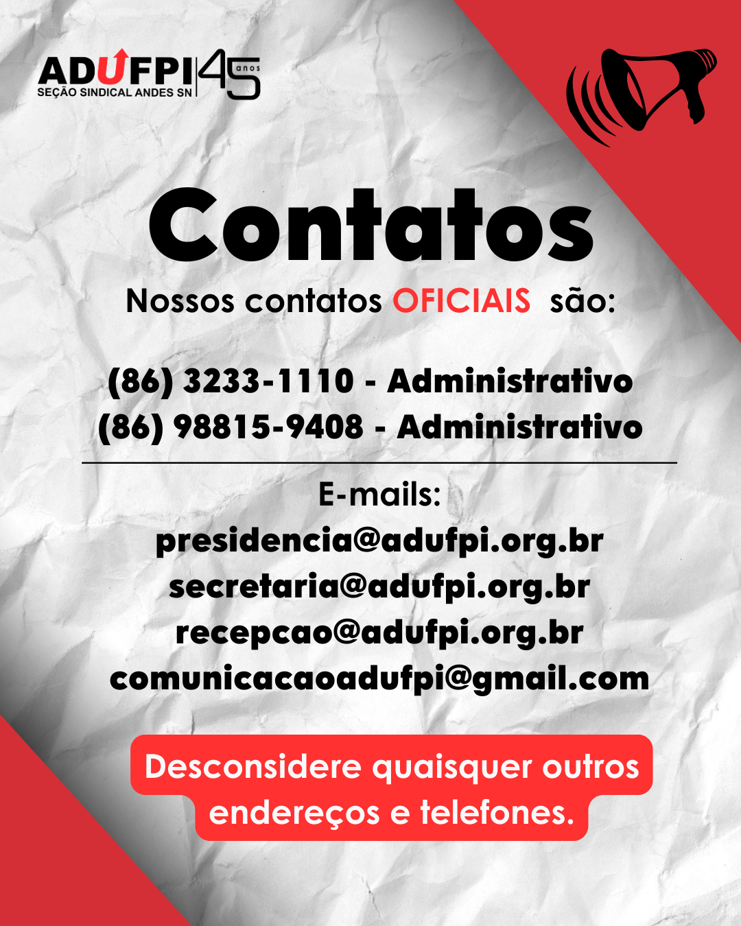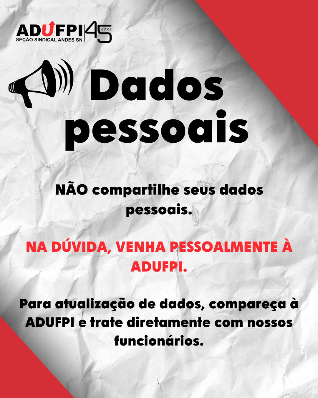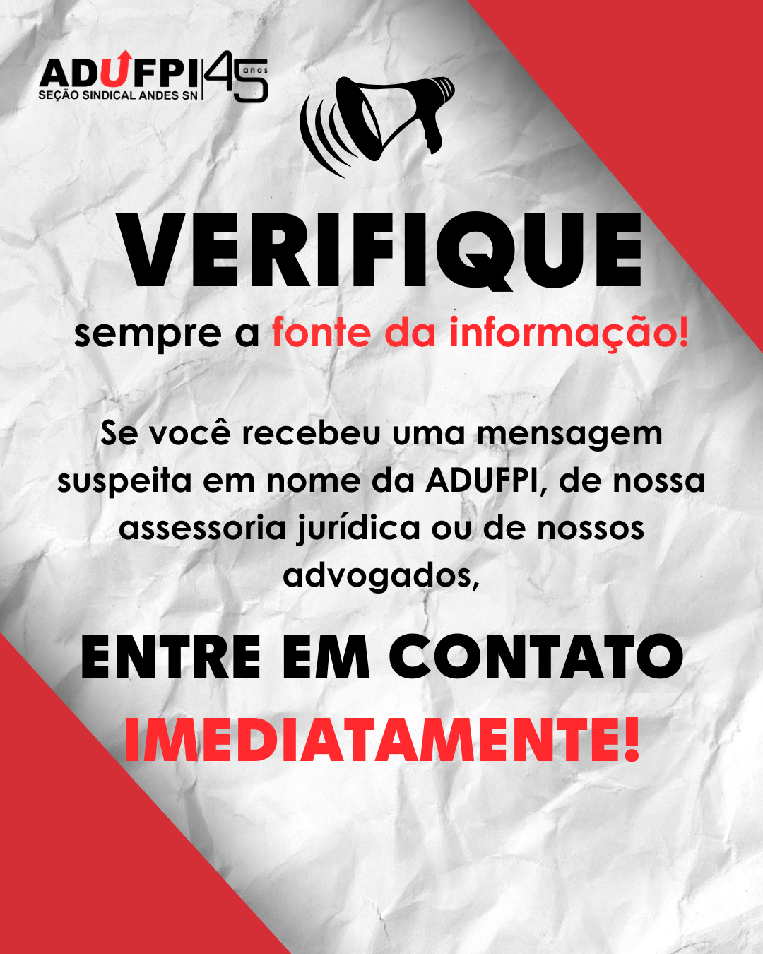 Independente de qualquer circunstância ou alegação, O DOCENTE ASSOCIADO DEVE SEMPRE PROCURAR A ADUFPI PARA CONFIRMAR A VERACIDADE DE QUALQUER DADO OU COMUNICAÇÃO RECEBIDA.