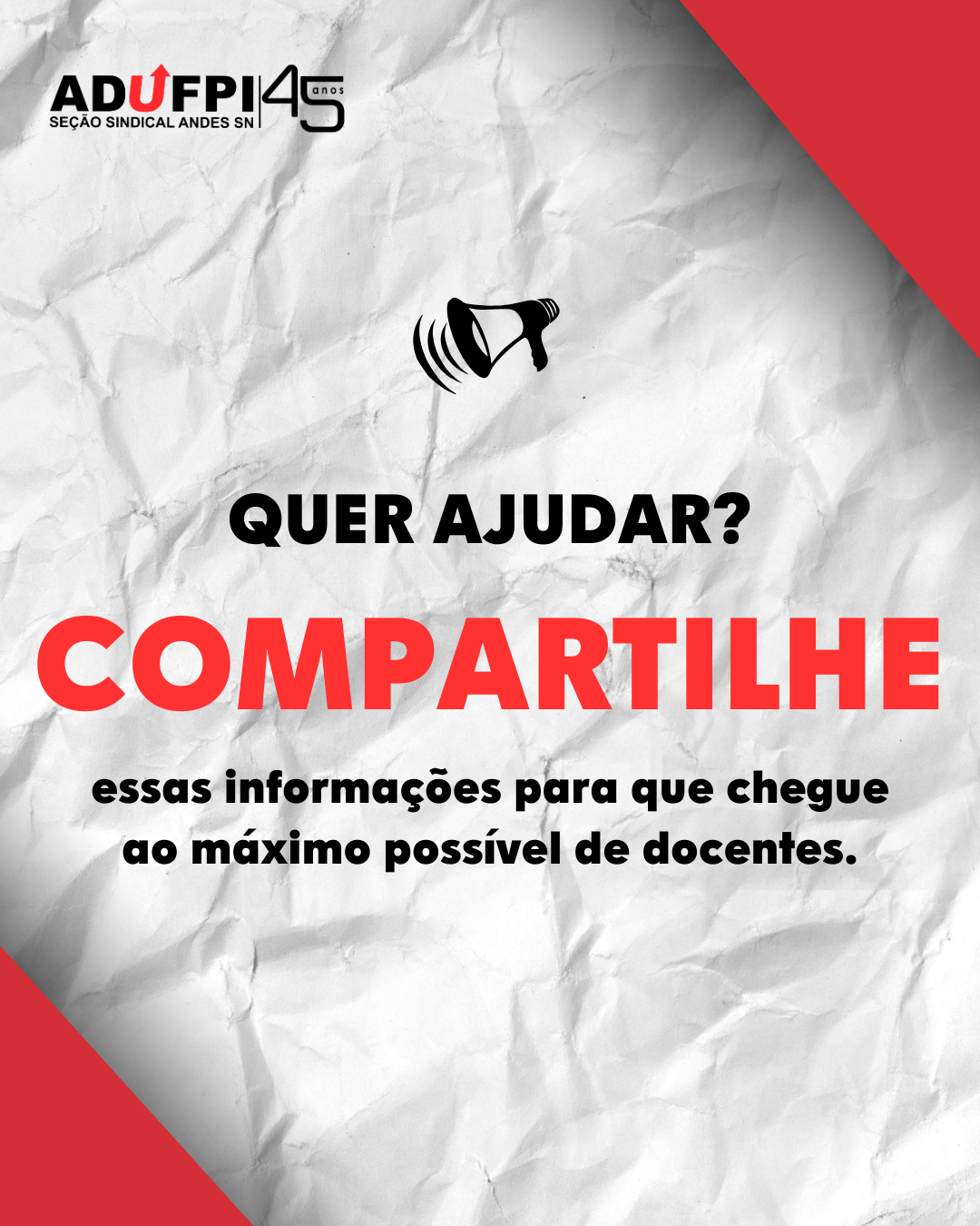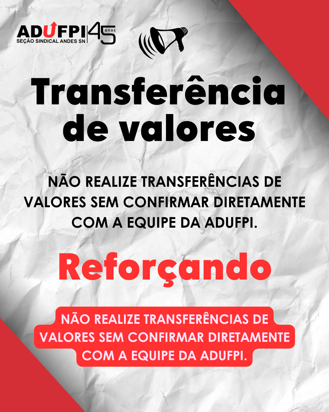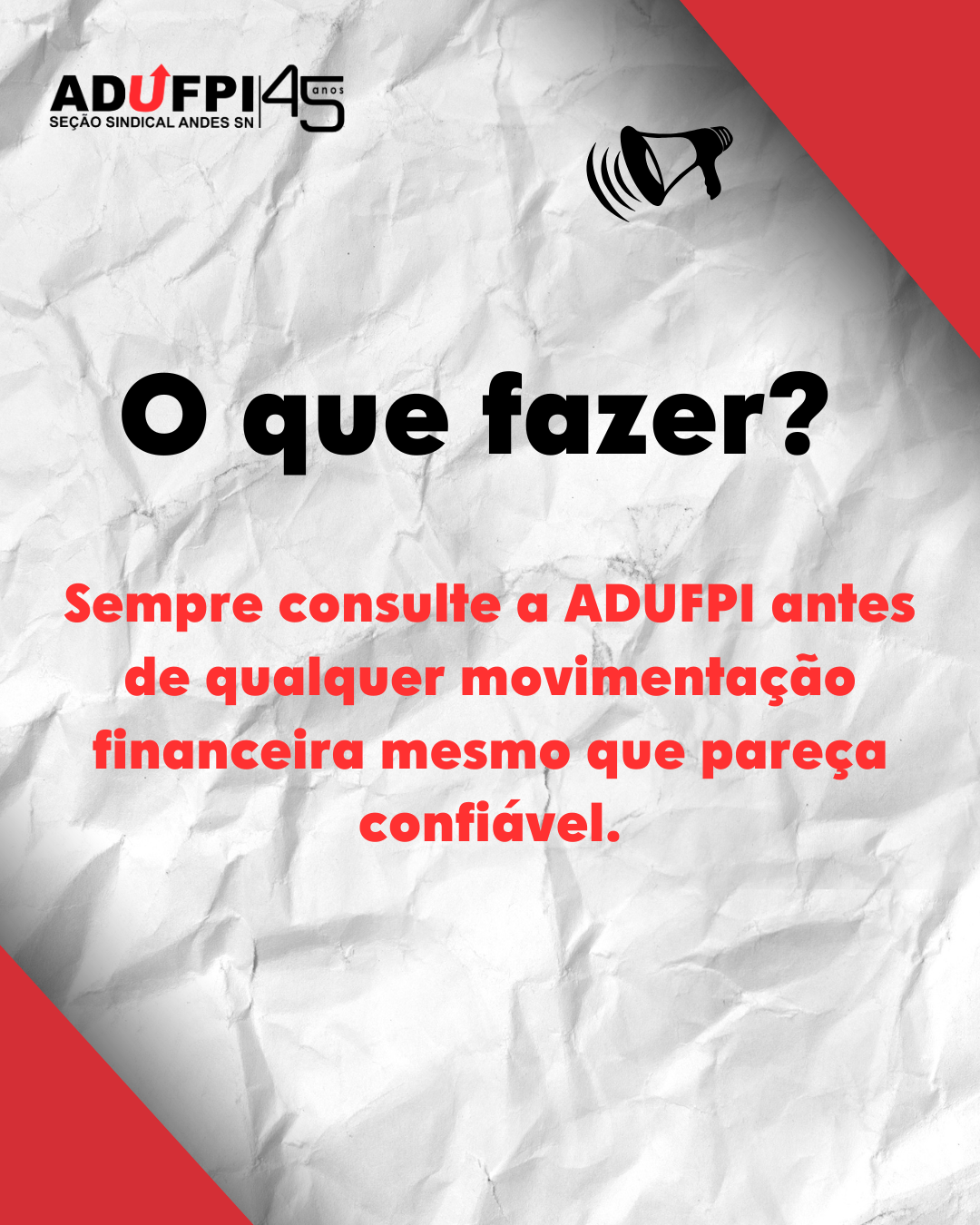 Independente de qualquer circunstância ou alegação, O DOCENTE ASSOCIADO DEVE SEMPRE PROCURAR A ADUFPI PARA CONFIRMAR A VERACIDADE DE QUALQUER DADO OU COMUNICAÇÃO RECEBIDA.