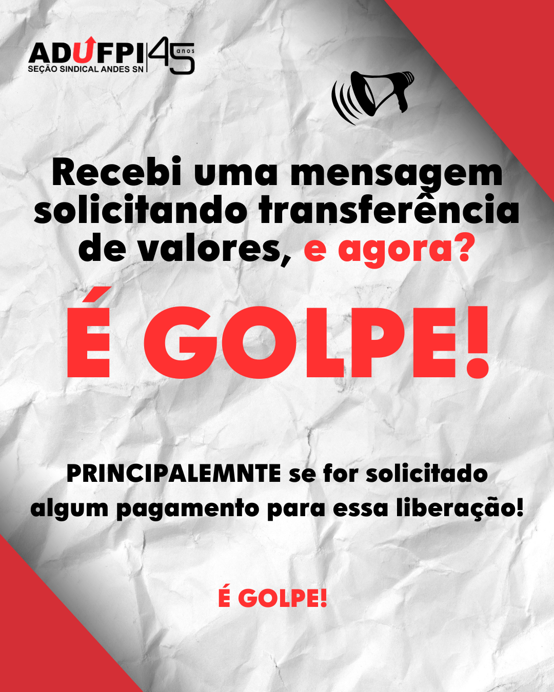 Alertamos todos os docentes associados da ADUFPI: estão em andamento diversas tentativas de golpes que visam prejudicar nossa categoria. Essas ações, muitas vezes, são disfarçadas de informações oficiais ou oportunidades falsas, e o objetivo é claro: enganar e explorar.